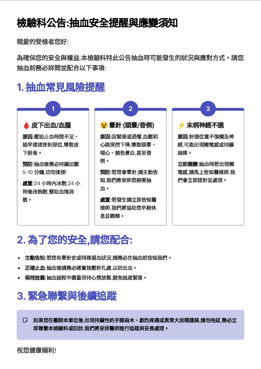 - 送檢時須連同檢驗單及檢體送至檢驗科。